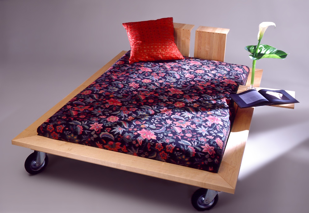 Ist in Ihrem Leben Platz für Bettgeschichten? In diesem Bett schon: auf der Buchablage! "Rolliges" Modell (mit Industrierollen) aus massivem Ahorn.