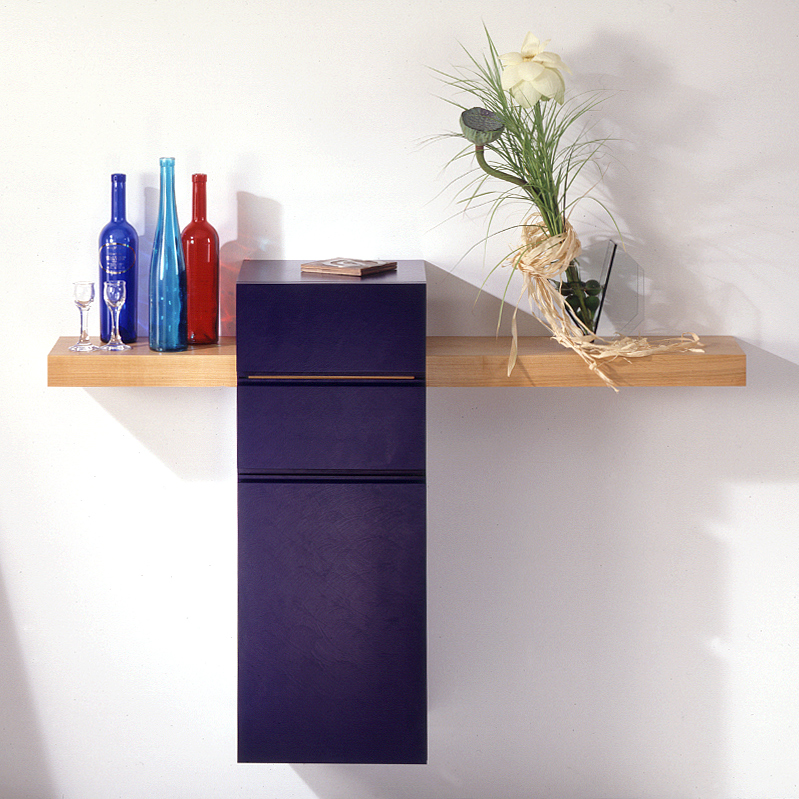 Lassen Sie es hängen: im Flur als Telefontischchen, im Schlafzimmer als Ablage. Sideboard mit Schubladen wie bei einem Dielenschränkchen aus farbig lackiertem MDF und Kirsche naturlackiert.