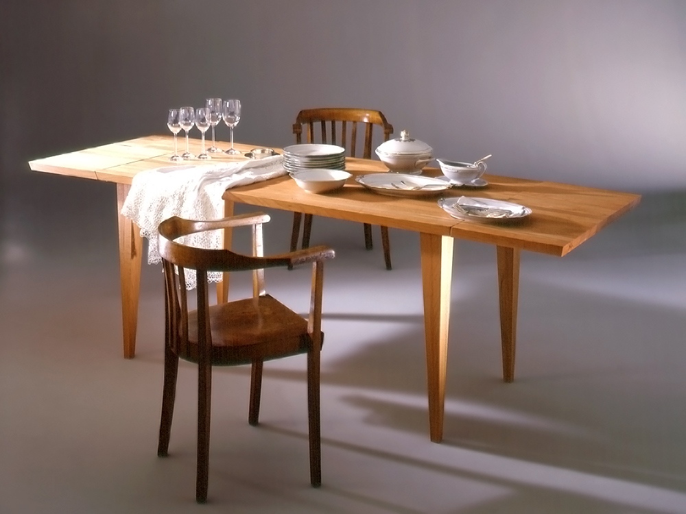 Hier können Sie lang und länger tafeln: Der massive Buchentisch hat Verlängerungsplatten.