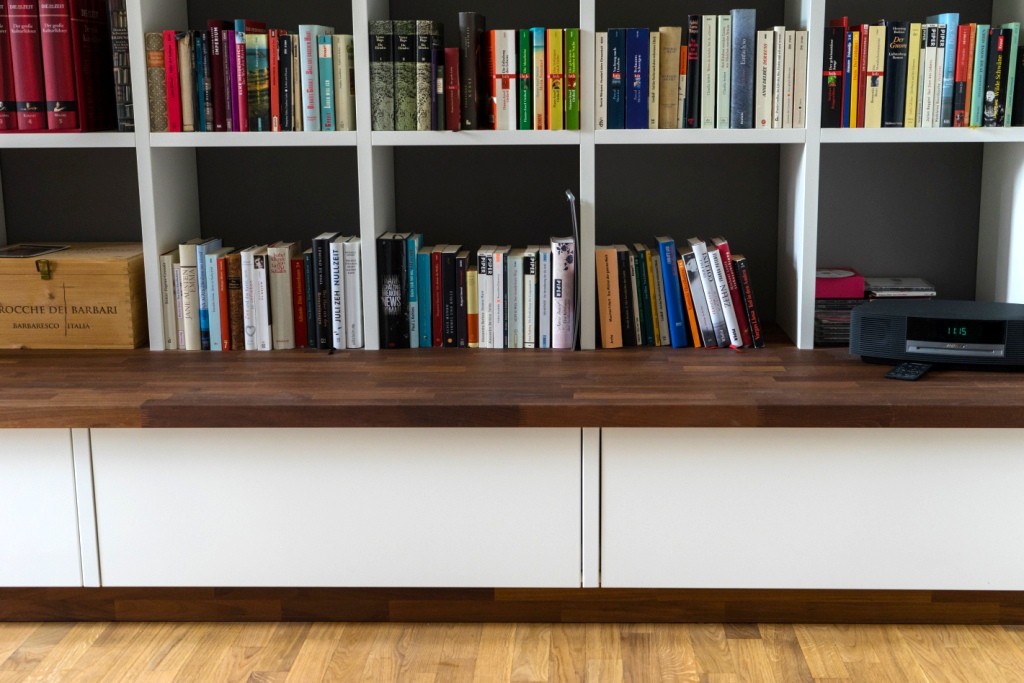 Der tiefe Schubladenunterbau bietet einigen Leuten Sitzgelegenheiten beim schmökern.