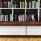 Regal aus seidenmattem Kunststoff und massiver geölter Akazie.