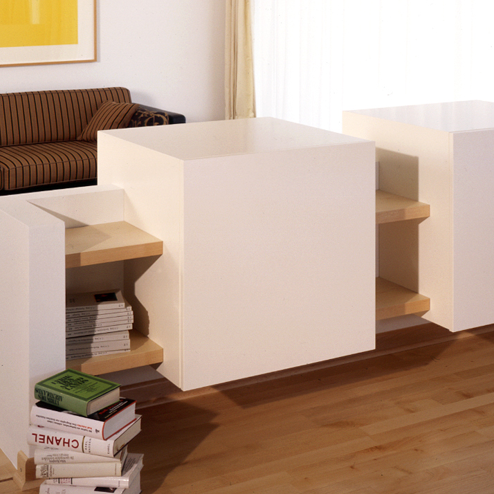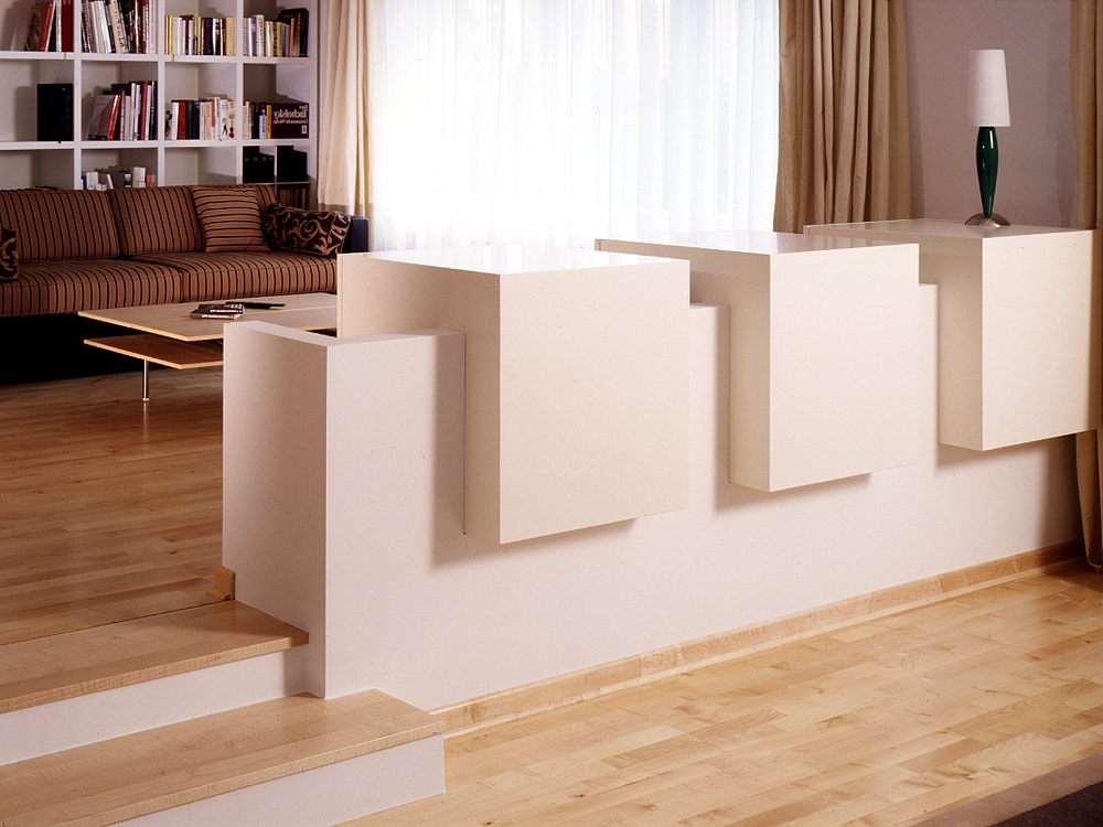 Raffinierter Raumteiler aus lackierter MDF, Gipskarton und furniertem Ahorn. Sieht klasse aus und schafft auch noch Platz für Bücher!