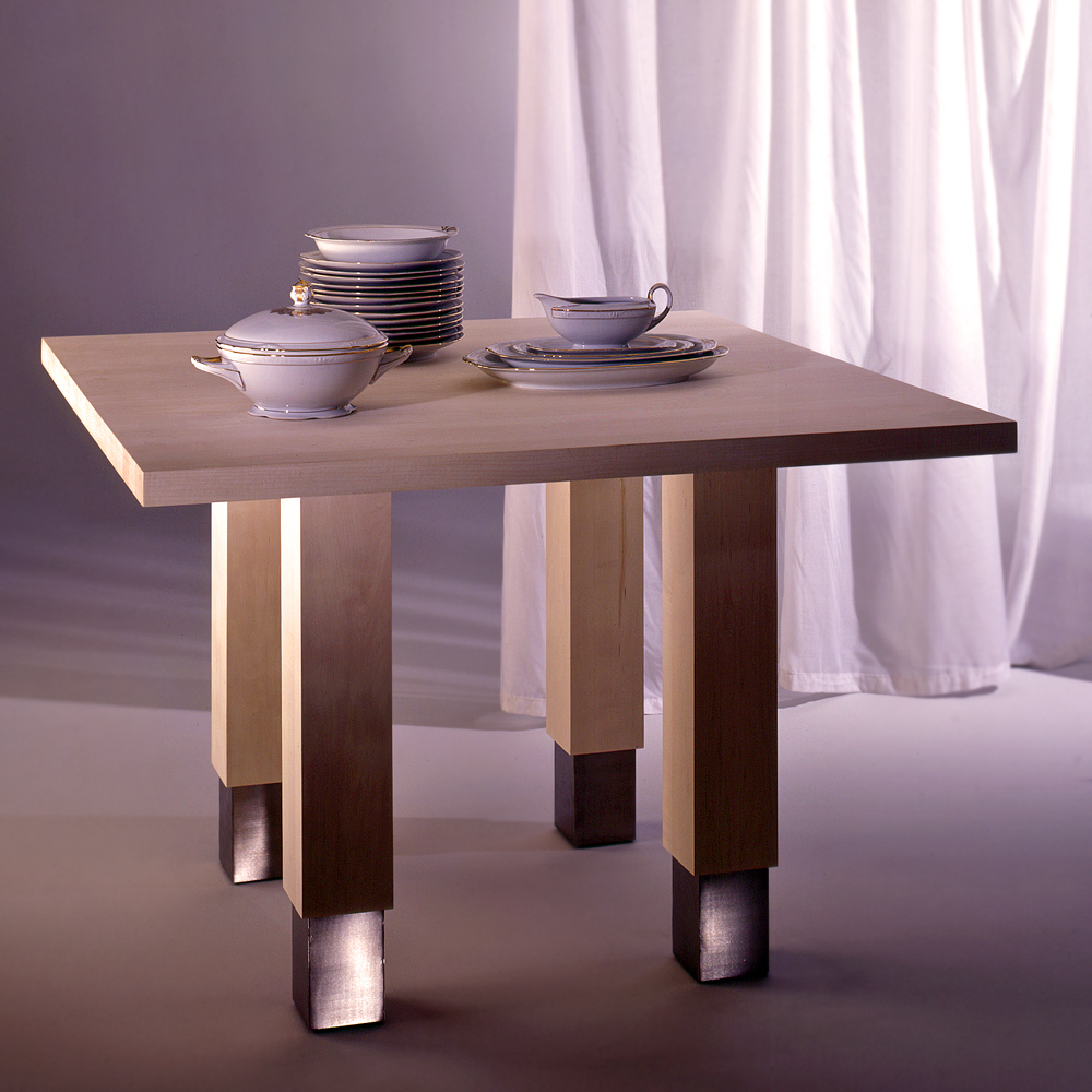 Wie auf Zehenspitzen steht dieser Esstisch aus gebleichtem Ahorn. Die stabilen "Zehen" tragen Edelstahl-Manschetten.